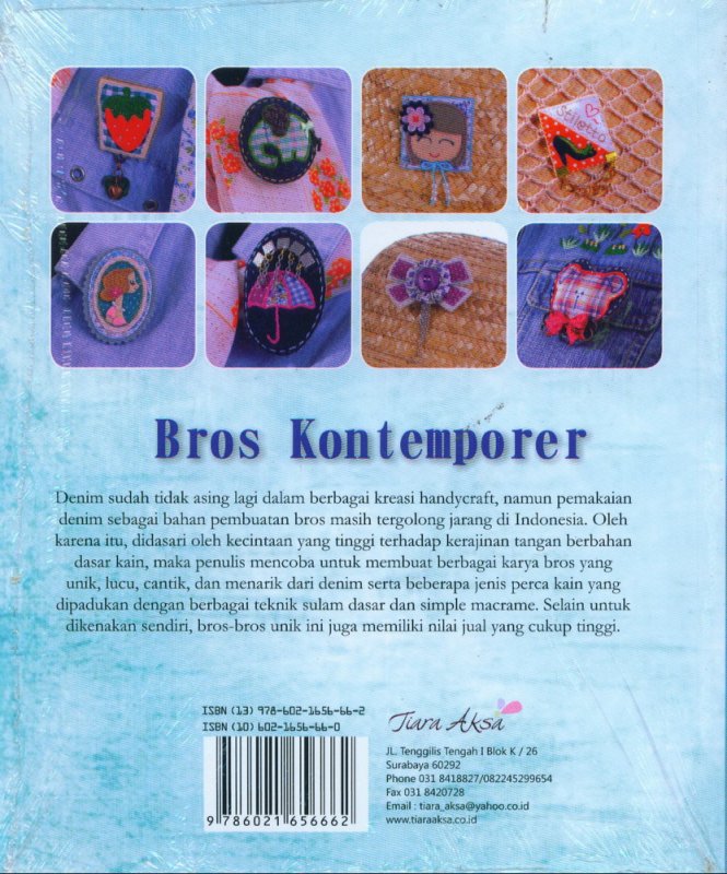 Denim sudah tidak asing lagi dalam berbagai kreasi handycraft, namun pemakaian denim sebagai bahan pembuatan bros masih tergolong jarang di Indonesia. Oleh karena itu, didasari oleh kecintaan yang tinggi terhadap kerajinan tangan berbahan dasar kain, maka penulis mencoba untuk membuat berbagai karya bros yang unik, lucu, cantik, dan menarik dari denim serta beberapa jenis perca kain yang dipadukan dengan berbagai teknik sulam dasar dan simple macrame. Selain untuk dikenakan sendiri, bros-bros unik ini juga memiliki nilai jual yang cukup tinggi.