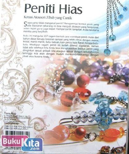 Buku ini mengulas 157 ragam bentuk cara membuat peniti mulai dari bahan dasar berupa lonjoran sampai yang telah dihias dengan monte, kristal, manik-manik, batu-batuan, kain perca, kain flanel, hingga bulu-bulu. Meskipun ragam peniti ini sudah dikenal dipasaran, namun tidak ada salahnya bila Anda bisa mengkreasikan bentuk peniti yang diinginkan sesuai pribadi kita ataupun sesuai dengan kebutuhannya sehingga kta akan dengan mudah menkombinasikannya dengan jilbab atau busana Anda.