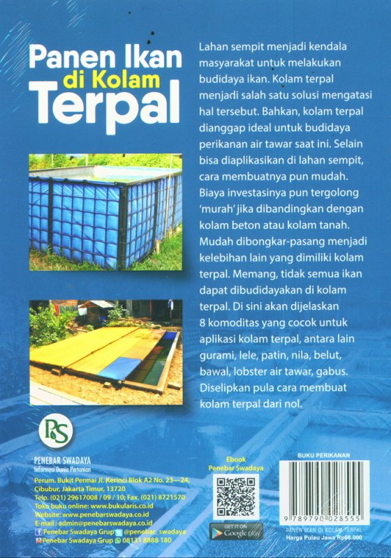 Biaya investasinya pun tergolong 'murah'jika dibandingkan dengan kolam beton atau kolam tanah. Mudah dibongkar-pasang menjadi kelebihan lain yang dimiliki kolam terpal. Memang, tidak semua ikan dapat dibudidayakan di kolam terpal. Di sini akan dijelaskan 8 komoditas yang cocok untuk aplikasi kolam terpal, antara lain gurami, lele, patin, nila, belut, bawal, lobster air tawar, gabus. Diselipkan pula cara membuat kolam terpal dari nol.