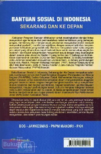 Buku Bantuan Sosial di Indonesia, Sekarang dan Ke Depan merupakan salah satu sumbangan penulis dari Pusat Kebijakan Anggaran Pendapatan dan Belanja Negara (PK-APBN), Badan Kebijakan Fiskal, Kementerian Keuangan, sebagai bahan masukan untuk menentukan kebijakan dalam mengalokasikan anggaran program bansos dalam rangka mengembangkan kualitas hidup masyarakat miskin terutama dari tingkat pendidikan, tingkat kesehatan, pemberdayaan masyarakat, maupun perlindungan sosial. Buku ini mengkaji kebijakan bansos yang sudah dilaksanakan dan ke depan, di mana pengembangan kajian terkait bansos menjadi salah satu tugas peneliti dalam memenuhi Key Performance Index (KPI) Badan Kebijakan Fiskal.