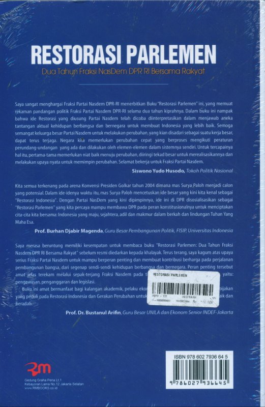 Saya sangat menghargai Fraksi Partai Nasdem DPR RI menerbitkan Buku Restorasi Parleme"ini yang memuat rekaman pandangan politik fraksi Partai Nasdem DPR-RI selama dua tahun kiprahnya.Dalam buku ini nampak bahawa ide Restorasi yang diusung Partai Nasdem telah dicoba diinterprestasikan dalam menjawab aneka tantangan aktual kehidupan berbangsa dan bernegara untuk membuat Indonesia yang lebih baik.Sempga semangat keluarga besar Partai Nasdem untuk melakukan perubahan,yang kian disadari sebagai suatu kerja besar. dapat terus terjaga.Negara kita memerlukan perubahan cepat yang berproses mengikuti peraturan perundang-undangan yang ada dan dilakukan oleh elemen-elemen dalam sistemnya sendiri.Untuk tercapainya hal itu,pertama-tama memerlukan niat baik menuju perubahan,diiringi tekad besar untuk merealisasikannya dan melakukan upaya nyata untuk memimpin perubahan.Selamat bekerja untuk Fraksi Partai Nasdem.