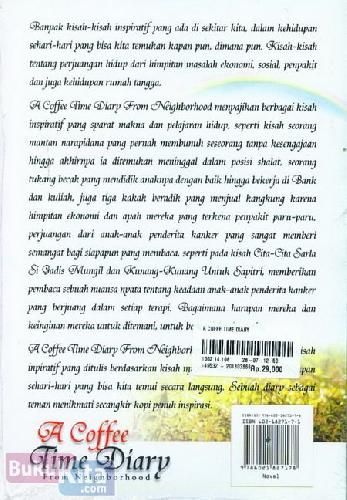 A Coffee Time Diary From Neighborhood menyajikan berbagai kisah inspiratif yang syarat makna dan pelajaran hidup, seperti kisah seorang mantan narapidana yang pernah membunuh seseorang tanpa kesengajaan hinga akhirnya ia ditemukan meninggal dalam posisi shalat, seorang tukang becak yang mendidik anaknya dengan baik hingga bekerja di Bank dan kuliah, juga tiga kakak beradik yang menjual kangkung karena himpitan ekonomi dan ayah mereka yang terkena penyakit paru-paru, perjuangan dari anak-anak penderita kanker yang sangat memberi semangat bagi siapapun yang membaca, seperti pada kisah Cita-Cia Saria Si Gadis Mungil dan Kunang-Kunang Untuk Sapiri, memberikan pembaca sebuah nuansa nyata tentang keadaan anak-anak penderita kanter yang berjuang dalam setiap terapi. Bagaimana harapan mereka dan keinginan mereka untuk ditemani...