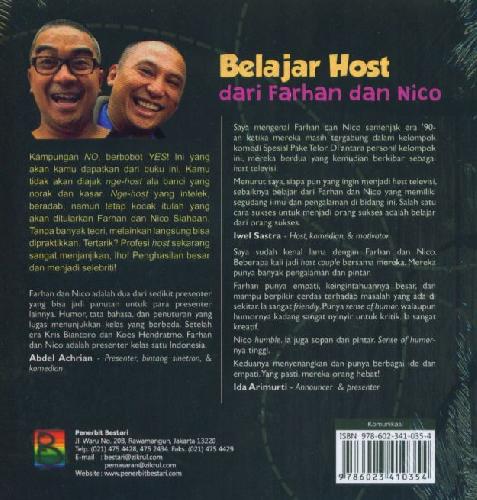 Kampungan NO, berbobot YES! Ini yang akan kamu dapatkan dari buku ini. Kamu tidak akan diajak nge-host ala banci yang norak dan kasar. Nge-host yang intelek, beradab, namun tetap kocak itulah yang akan ditularkan Farhan dan Nico Siahaan. Tanpa banyak teori, melainkan langsung bisa dipraktikkan. Tertarik? Profesi host sekarang sangat menjanjikan, Iho! Penghasilan besar dan menjadi selebriti!