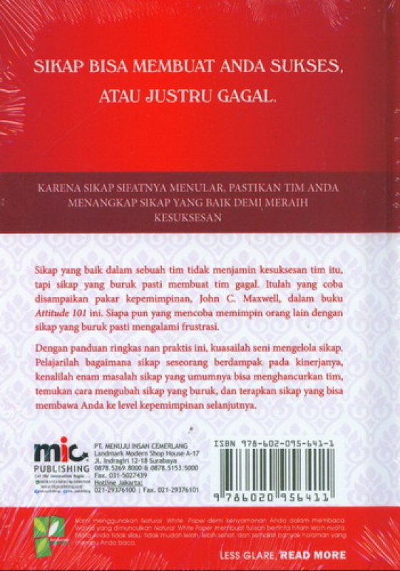 Sikap yang baik dalam sebuah tim tidak menjamin kesuksesan tim itu, tapi sikap yang buruk pasti membuat tim gagal. Itulah yang coba disampaikan pakar kepemimpinan, John C. Maxwell, dalam buku Attitude 101 ini. Siapa pun yang mencoba memimpin orang lain dengan sikap yang buruk pasti mengalami frustrasi.