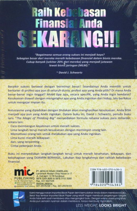 Antusiasme yang dipadukan dengan tindakan akan menghasilkan kesuksesan. Anda BISA menjadi apa pun yang Anda inginkan. Dalam buku ini, David J. Schwartz, penulis buku laris "The Magic of Thinking Big" menyediakan formula rahasia sukses para miliarder, antara lain:
