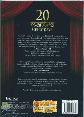 Buku 20 Mantra Cepat Kaya yang ditulis oleh seorang visioner muda Indoesia---Joni Lis Efendi---ini wajib dibaca bagi siapa saja yang ingin mewujudkan segala mimpinya jadi kenyataan. Sebuah buku yang penuh inspirasi dan mampu membangkitkan energi positif diri untuk pekikkan, "Saya juga bisa sukses!" sebab buku ini menyajikan resep yang sederhana, mudah, dan aplikatif