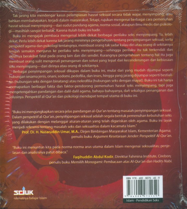 Berbagai penyimpangan seksual dikupas dalam buku ini, mulai dari yang mudah dijumpai seperti hubungan sesama jenis, onani, sodomi, pedofilia, dan inses, hingga yang jarang dijumpai seperti bestialitas (hubungan seks dengan binatang) atay nekrofilia (hubungan seks dengan mayat). Buku ini tak hanya memaparkan berabgai fakta dan faktor pendorong pemenuhan hasrat seks menyimpang, tapi juga mengetengahkan pandangan dan dalil-dalil agama, bahaya-bahayanya, dan sekaligus penanganan dan solusinya...