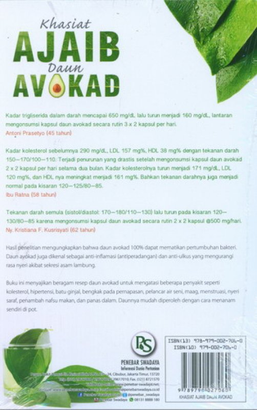 Buku ini menyajikan beragam resep daun avokad untuk mengatasi beberapa penyakit seperti kolesterol, hipertensi, batu ginjal, bengkak pada pernapasan, pelancar air seni, maag, menstruasi, nyeri saraf, penambah nafsu makan, dan panas dalam. Daunnya mudah diperoleh dengan cara menanam sendiri di pot.