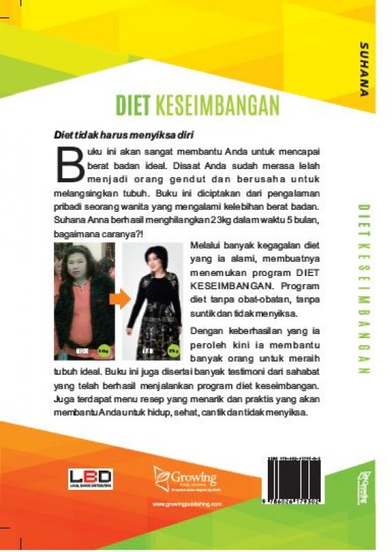 Buku ini akan sangat membantu anda untuk mencapai berat badan ideal. disaat anda sudah merasa lelah menjadi orang gendut dan berusaha untuk melangsingkan tubuh. buku ini diciptakan dari pengalaman pribadi seorang wanita yang mengalami kelebihan berat badan. Suhana anna berhasil menghiangkan 23 KG dalam waktu 5 bulan.