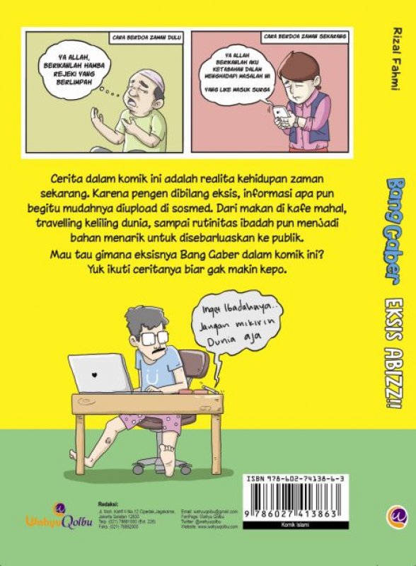 Cerita dalam komik ini adalah realita kehidupan zaman sekarang. Karena pengen dibilang eksis, informasi apa pun begitu mudahnya diupload di sosmed. Dari makan di kafe mahal, travelling keliling dunia, sampai rutinitas ibadah pun menjadi bahan menarik untuk disebarluaskan ke publik.