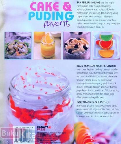 TAK PERLU BINGUNG lagi jika ingin menyajikan cake dan puding bagi keluarga, teman, atau kolega. Buku ini menyajikan aneka cake dan puding yang dapat digunakan sebagai hidangan penutup untuk setiap momen. Bahkan, sajian desert in a jar yang sedang tren juga ditampilkan dalam buku ini.