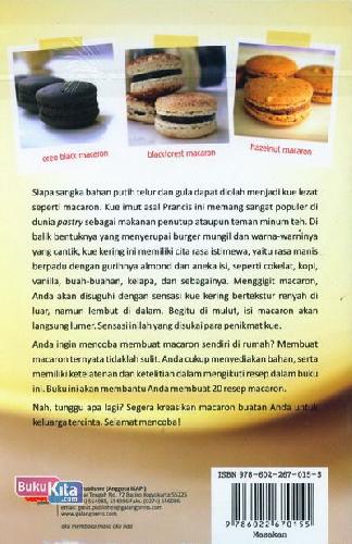 Anda ingin mencoba membuat macaron sendiri di rumah? Membuat macaron ternyata tidaklah sulit. Anda cukup menyediakan bahan, serta memiliki ketelatenan dan ketelitian dalam mengikuti resep dalam buku ini. Buku ini akan membantu Anda membuat 20 resep macaron.