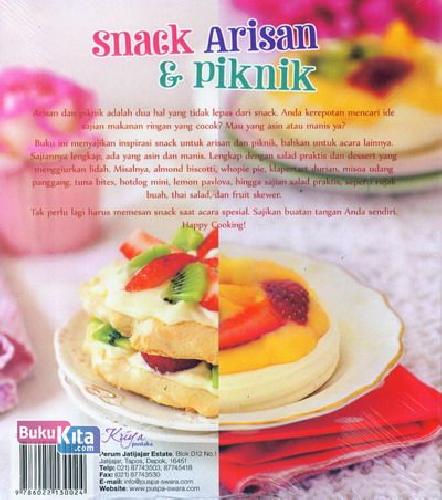 Buku ini menyajikan inspirasi snack untuk arisan dan piknik, bahkan untuk acara lainnya. Sajiannya lengkap, ada yang asin dan manis. Lengkap dengan salad praktis dan dessert yang menggiurkan lidah. Misalnya, almond biscotti, whopie pie, klappertart durian, misoa udang panggang, tuna bites, hotdog mini, lemon pavlova, hingga sajian salad praktis, seperti rujak buah, thai salad, dan fruit skewer.