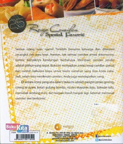 Semua orang suka ngemil. Terlebih bersama keluarga dan ditemani secangkir teh atau kopi. Namun, tak semua camilan aman dikonsumsi, karena banyaknya kandungan berbahaya. Membuat camilan sendiri adalah pilihan yang tepat. Buku ini menyajikan aneka resep camilan spesial dan contoh kalkulasi biaya untuk bisnis rumahan yang bisa Anda coba. Jadi, selain bisa menikmati camilan, Anda juga mendapatkan uang. Di antara resep yang ada dalam buku ini adalah pangsit pedas goreng, cireng isi ayam, ketan gulung bumbu, risoles mayones keju, bakwan tofu, martabak rendang mini, dan banyak masih banyak lagi. Selamat memasak camilan dan berbisnis!