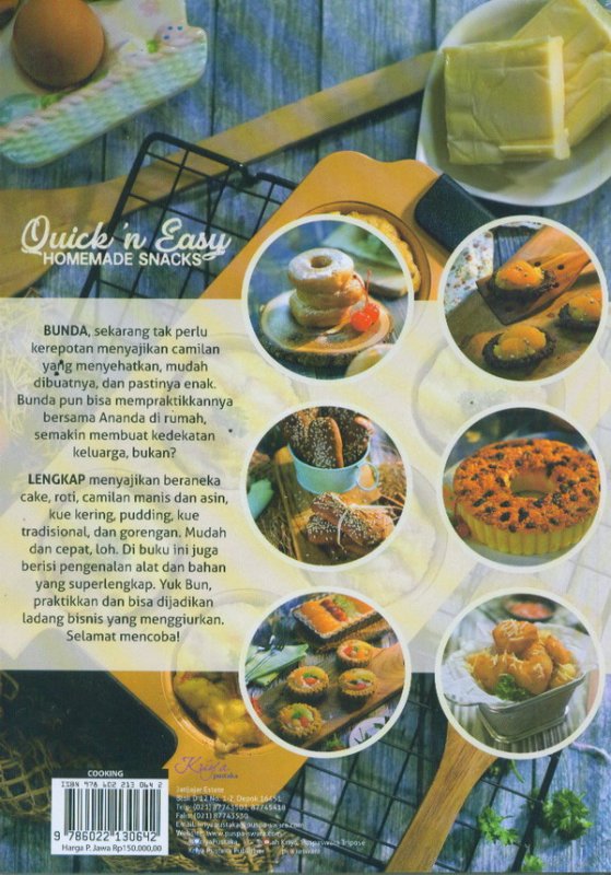 kue kering, pudding, kue tradisional, dan gorengan. Mudah dan cepat, loh. Di buku ini juga berisi pengenalan alat dan bahan yang superlengkap. Yuk Bun, praktikkan dan bisa dijadikan ladang bisnis yang menggiurkan. Selamat mencoba!