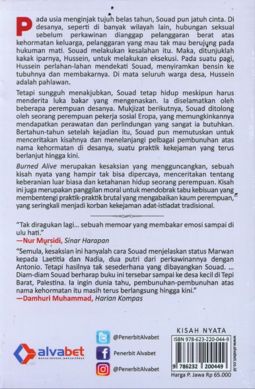 Burned Alive merupakan kesaksian yang mengguncangkan, sebuah kisah nyata yang hampir tak bisa dipercaya, menceritakan tentang keberanian luar biasa dan ketahanan hidup seorang perempuan. Kisah ini juga merupakan panggilan moral untuk mendobrak tabu kebisuan yang membentengi praktik-praktik brutal yang mengabaikan kaum perempuan, yang seringkali menjadi korban kekejaman adat-istiadat tradisional.