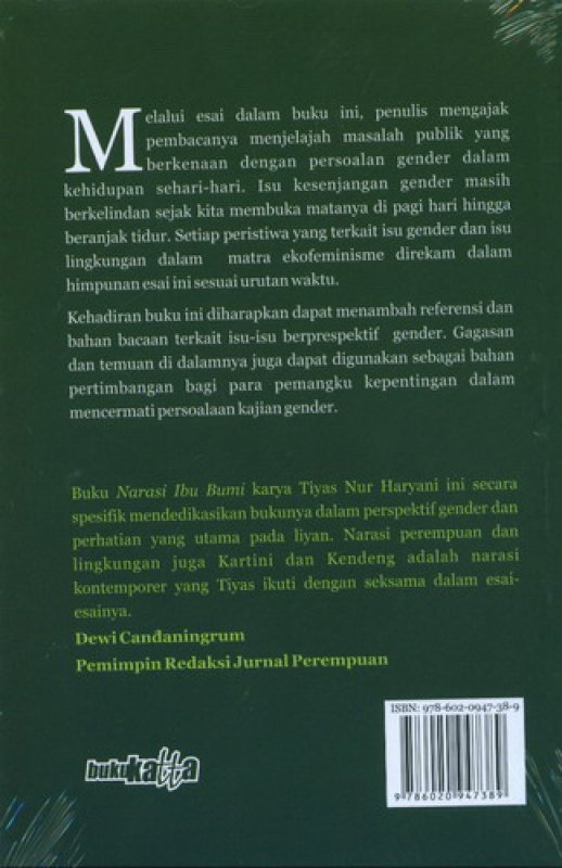 Buku Narasi Ibu Bumi karva Tiyas Nur Haryani ini secara spesifik mendedikasikan bukunya dalam perspektif gender dan perhatian yang utama pada liyan. Narasi perempuan dan lingkungan juga Kartini dan Kendeng adalah narasi kontemporer yang Tiyas ikuti dengan seksama dalam esai-esainva.