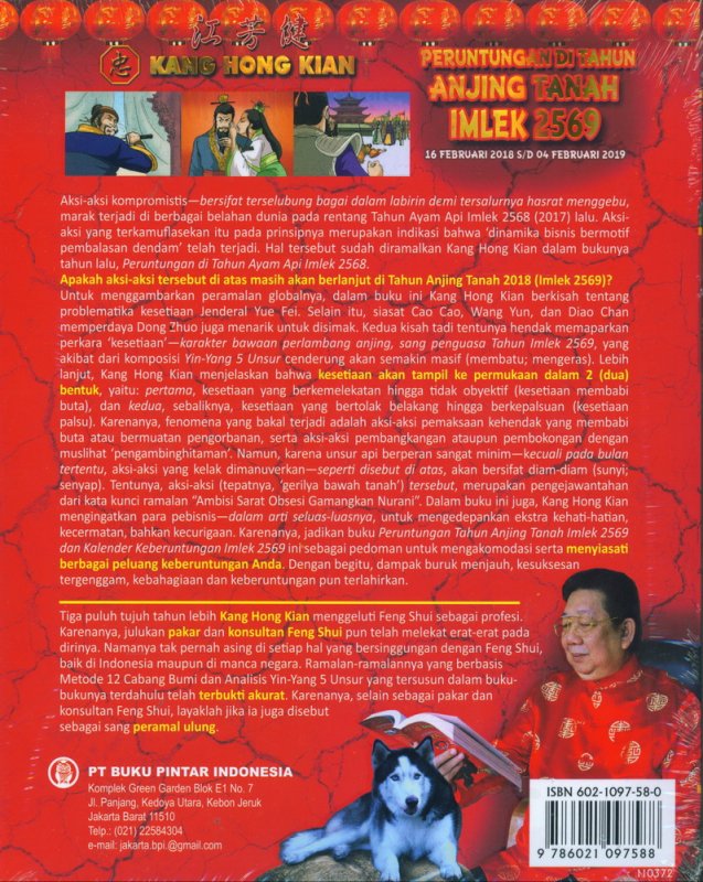 Dalam buku ini juga, Kang Hong Kian mengingatkan para pebisnis--dalam arti seluas-luasnya, untuk mengedepankan ekstra kehati-hatian, kecermatan, bahkan kecurigaan. Karenanya, jadikan buku Peruntungan Tahun Anjing Tanah Imlek 2569 dan Kalender Keberuntungan Imlek 2569 inrsebagai pedoman untuk mengakomodasi serta menyiasati berbagai peluang keberuntungan Anda. Dengan begitu, dampak buruk menjauh, kesuksesan tergenggam, kebahagiaan dan keberuntungan pun terlahirkan.