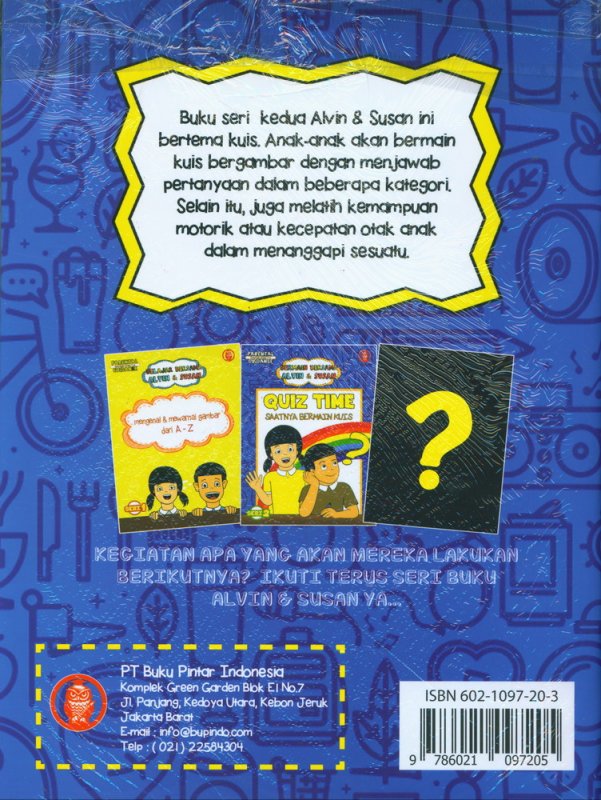 Buku seri kedua Alvin & Susan ini bertema kuis. Anak-anak akan bermain kuis bergambar dengan menjawab pertanyaan dalam beberapa kategori. Selain itu, juga melatih kemampuan motorik atau kecepatan otak anal dalam menanggapi sesuatu.