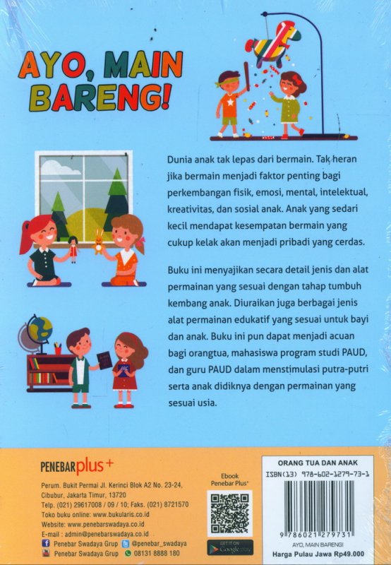 Buku ini menyajikan secara detail jenis dan alat permainan yang sesuai dengan tahap tumbuh kembang anak. Diuraikan juga berbagai jenis alat permainan edukatif yang sesuai untuk bayi dan anak. Buku ini pun dapat menjadi acuan bagi orangtua, mahasiswa program studi PAUD, dan guru PAUD dalam menstimulasi putra-putri serta anak didiknya dengan permainan yang sesuai usia.