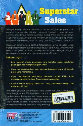 Sebagai tenaga penjual profesional, Anda menghadapi pasar dan pembeli yang semakin kritis dan menuntut, Pembeli kini memiliki akses cepat ke segudang informasi mengenai produk Anda, riwayat kinerjanya (juga kinerja Anda), harga yang Anda tawarkan, keluhan para pembeli, kompetitor, serta berbagai hal lain yang dulu hanya diketahui oleh Anda. Hubungan baik memang penting, tetapi sekarang ini pelanggan Anda mengharapkan lebih. Superstar Sales disusun agar Anda dapat belajar, berlatih, mengevaluasi kebutuhan penjualan Anda, dan mengembangkan kemampuan menjual ala megabintang dalam 31 hari.