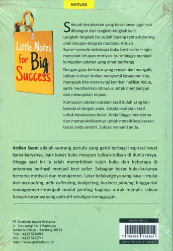Sebuah kesuksesan yang besar sesungguhnya dibangun dari langkah-langkah kecil. Langkah-langkah itu sudah barang tentu didorong oleh letupan-letupan motivasi. Ardian Syam penulis beberapa buku best seller rajin mencapatat letupan motivasi itu sehingga menjadi kumpulan catatan yang amat berharga, dalam bentuk LITTLE NOTES for BIG SUCCESS. Dengan gaya bertutur ang renyah dan mengalir, tulisan-tulisan ardian menyentil kesadaran kitamerenungi kembali hakikat hidup, serta memberikan stimulus untuk membangun dan mewujudkan impian. Kumpulan catatan-catatan kecil itulah yang siap membekali anda untuk meraih kesuksesan besar anda sendiri. Sukses menanti anda.