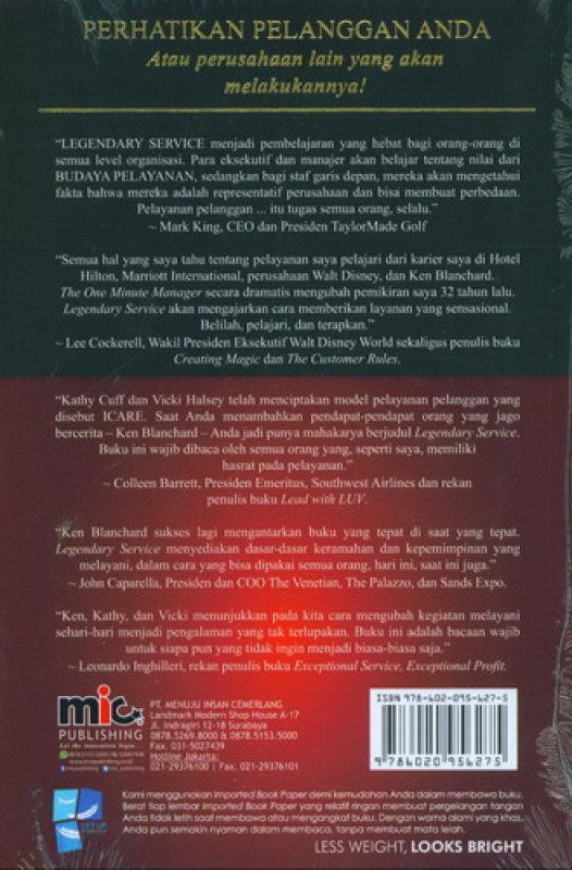 "Kathy Cuff dan Vicki Halsey tclah menciptakan model pelayanan pelanggan yang disebut ICARE. Saat Anda menambahkan pendapat-pendapat orang yang jago bereerita Ken Blanchard Anda jadi punya mahakarya berjudul Legendary Service. Buku ini wajib dibaca oleh semua orang yang, seperti saya, memiliki hasrat pada pelayanan."