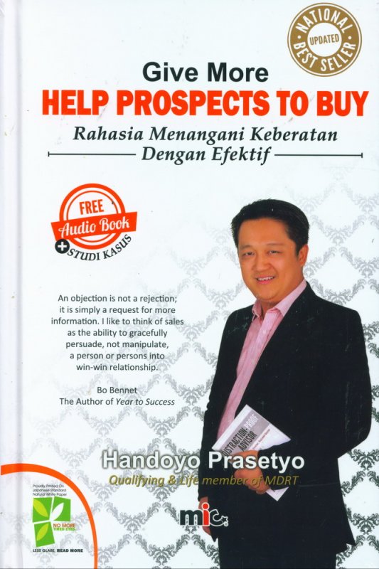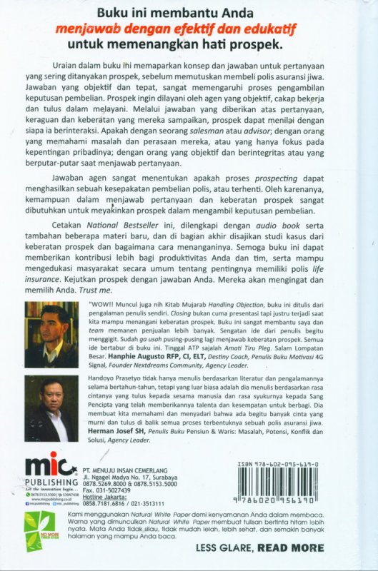 Cetakan National Bestseller ini, dilengkapi dengan audio book serta tambahan beberapa materi baru, dan di bagian akhir disajikan studi kasus dari keberatan prospek dan bagaimana cara menanganinya. Semoga buku ini dapat memberikan kontribusi lebih bagi produktivitas Anda dan tim, serta mampu mengedukasi masyarakat secara umum tentang pentingnya memiliki polis life insurance. Kejutkan prospek dengan jawaban Anda. Mereka akan mengingat dan memilih Anda. Trust me.