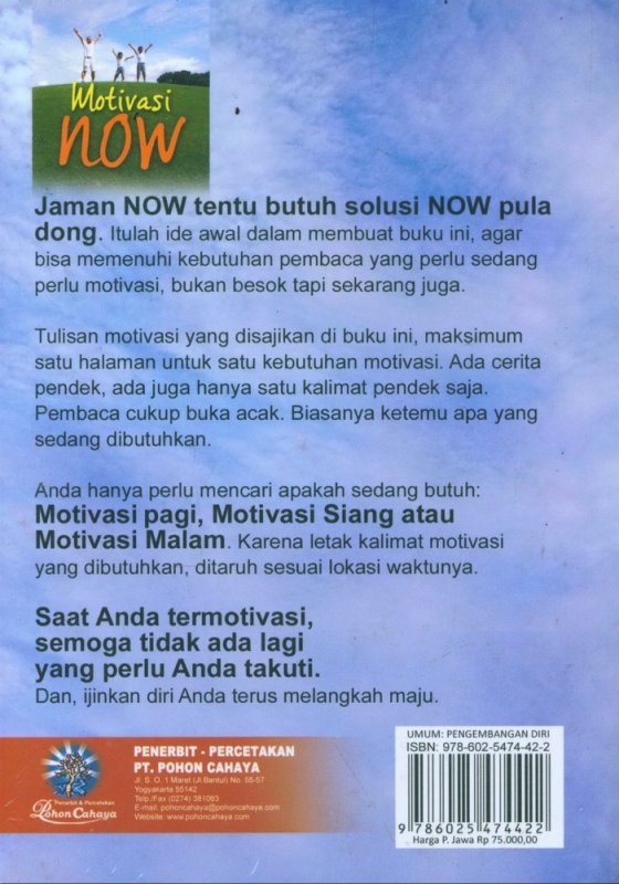 Jaman NOW tentu butuh solusi NOW pula dong. Itulah ide awal dalam membuat buku ini, agar bisa memenuhi kebutuhan pembaca yang perlu sedang perlu motivasi, bukan besok tapi sekarang juga.