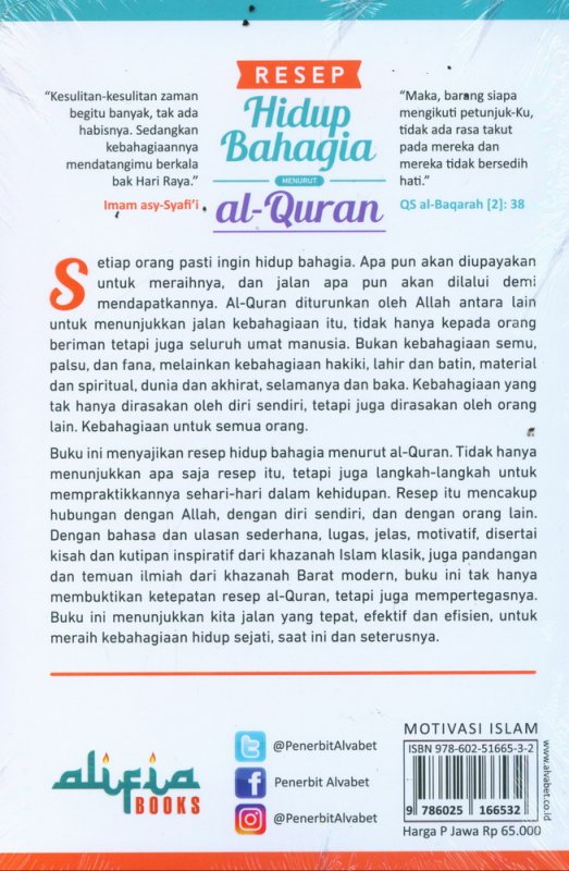 Buku ini menyajikan resep hidup bahagia menurut al-Quran. Tidak hanya menunjukkan apa saja resep itu, tetapi juga langkah-langkah untuk mempraktikkannya sehari-hari dalam kehidupan. Resep itu mencakup hubungan dengan Allah, dengan diri sendiri, dan dengan orang lain. Dengan bahasa dan ulasan sederhana, lugas, jelas, motivatif, disertai kisah dan kutipan inspiratif dari khazanah Islam klasik, juga pandangan dan temuan ilmiah dari khazanah Barat modern, buku ini tak hanya membuktikan ketepatan resep al-Quran, tetapi juga mempertegasnya. Buku ini menunjukkan kita jalan yang tepat, efektif dan efisien, untuk meraih kebahagiaan hidup sejati, saat ini dan seterusnya.