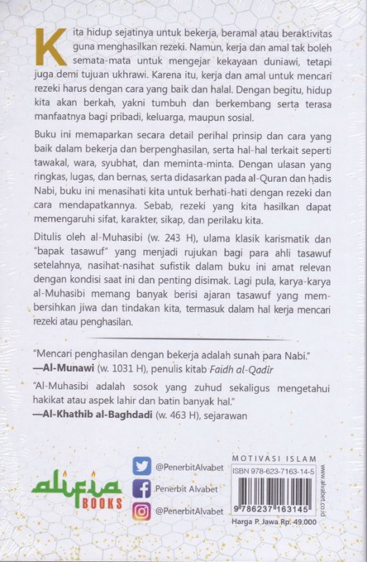 Ditulis oleh Al-Muhasibi, ulama klasik karismatik dan bapak tasawuf yang menjadi rujukan bagi para ahli tasawuf setelahnya, nasihat-nasihat sufistik dalam buku ini amat relevan dengan kondisi saat ini dan penting disimak. Lagi pula, karya-karya Al-Muhasibi memang banyak berisi ajaran tasawuf yang membersihkan jiwa dan tindakan kita, termasuk dalam hal kerja mencari rezeki atau penghasilan.