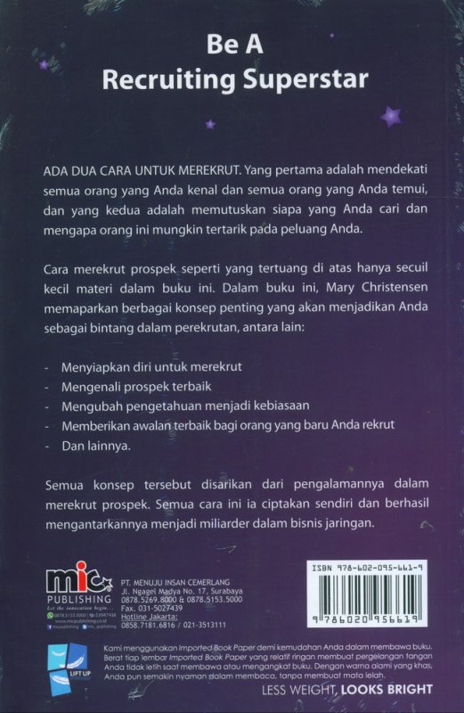 ADA DUA CARA UNTUK MEREKRUT. Yang pertama adalah mendekati semua orang yang Anda kerial dan semua orang yang Anda temui, dan yang kedua adalah memutuskan siapa yang Anda cari dan mengapa orang ini mungkin tertarik pada peluang Anda. Cara merekrut prospek seperti yang tertuang di atas hanya secuil kecil materi dalam buku ini. Dalam buku ini, Mary Christensen memaparkan berbagai konsep penting yang akan menjadikan Anda sebagai bintang dalam perekrutan, antara lain: