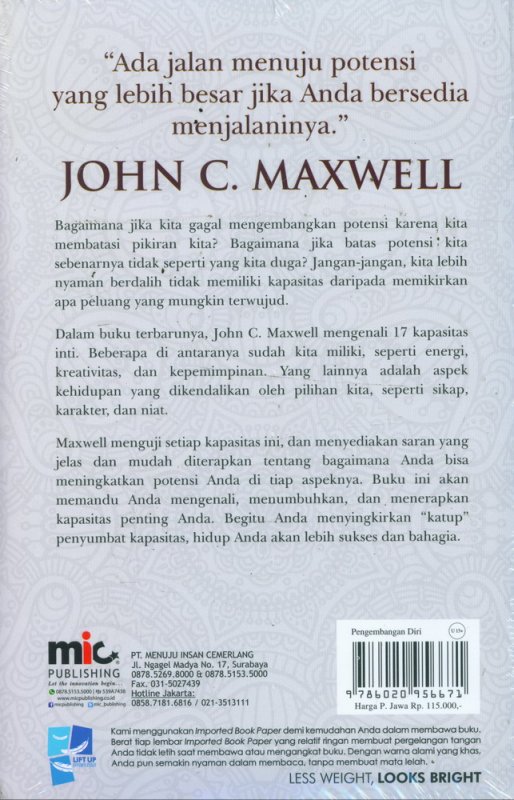 Maxwell menguji setiap kapasitas ini, dan menyediakan saran yang jelas dan mudah diterapkan tentang bagaimana Anda bisa meningkatkan potensi Anda di tiap aspeknya. Buku ini akan memandu Anda mengenali, menumbuhkan, dan menerapkan