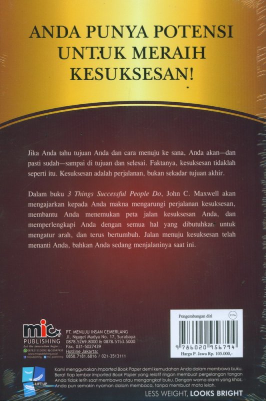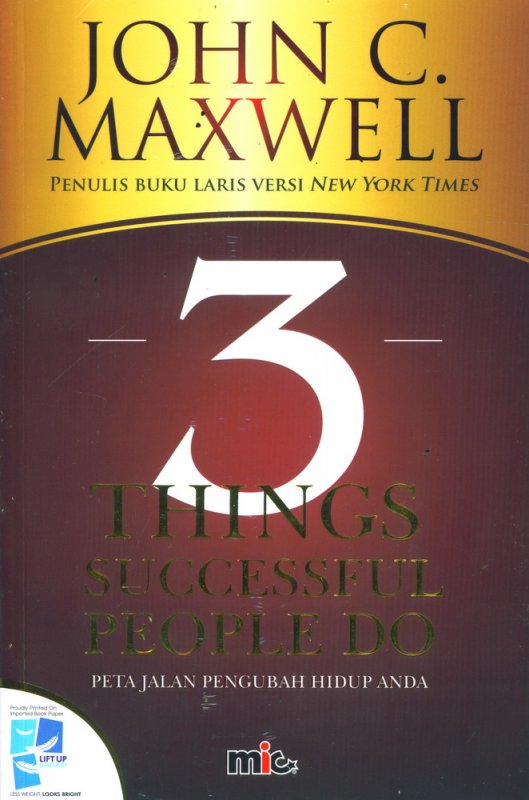 Dalam buku 3 Things Successful People Do, John C. Maxwell akan mengajarkan kepada Anda makna mengarungi perjalanan kesuksesan, membantu Anda menemukan peta jalan kesuksesan Anda, dan memperlengkapi Anda dengan semua hal yang dibutuhkan untuk mengatur arah, dan terus bertumbuh. Jalan menuju kesuksesan telah menanti Anda, bahkan Anda sedang menjalaninya saat ini.