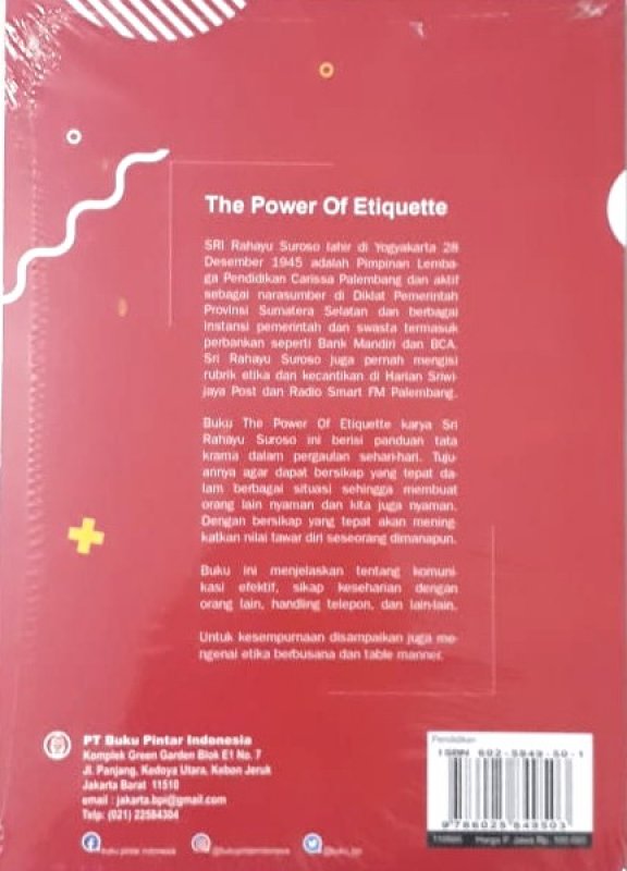 Buku The Power of Etiquette karya Sri Rahayu Suroso ini berisi panduan tata krama dalam pergaulan sehari-hari. Tujuannya agar dapat bersikap yang tepat dalam berbagai situasi sehingga membuat orang lain nyaman dan kita juga nyaman. Dengan bersikap yang tepat akan meningkatkan nilai tawar diri seseorang dimanapun.