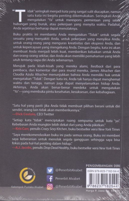 Merujuk pada kisah-kisahyang mereka alami,feedbackdari para pembaca, dan komentar dari para murid mereka, James Altucher dan Claudia Azula Altucher menunjukkan bahwa Anda memiliki hak untuk mengatakan Tidak. Dengan kata ini, Anda tak hanya dapat menghemat waktu dan tenaga, namun juga dapat menyelamatkan hidup Anda. Akhirnya, Anda akan benar-benar merdeka untuk mengatakan Yayang membuka pintu kesehatan, kesuksesan, dan kebahagiaan.