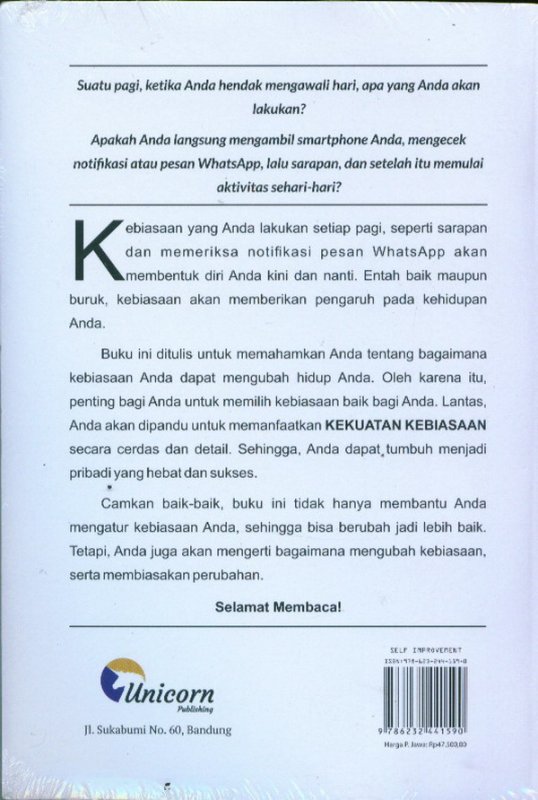 Kebiasaan yang Anda lakukan setiap pagi, seperti sarapan dan memeriksa notifikasi pesan WhatsApp akan membentuk diri Anda kini dan nanti. Entah baik maupun buruk, kebiasaan akan memberikan pengaruh pada kehidupan Anda. Buku ini ditulis untuk memahamkan Anda tentang bagaimana kebiasaan Anda dapat mengubah hidup Anda. Oleh karena itu, penting bagi Anda untuk memilih kebiasaan baik bagi Anda. Lantas, Anda akan dipandu untuk memanfaatkan KEKUATAN KEBIASAAN