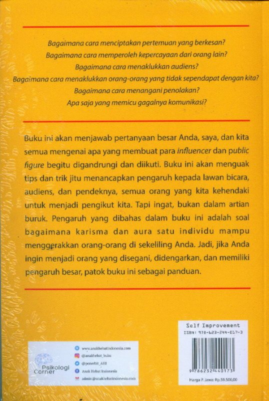 Buku ini akan menjawab pertanyaan besar Anda, saya, dan kita semua mengenai apa yang membuat para influencer dan public figure begitu digandrungi dan diikuti. Buku ini akan menguak tips dan trik jitu menancapkan pengaruh kepada lawan bicara, audiens, dan pendeknya, semua orang yang kita kehendaki untuk menjadi pengikut kita. Tapi ingat, bukan dalam artian
