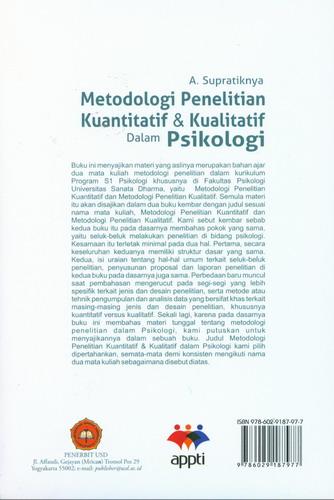 Buku ini menyajikan materi yang aslinya merupakan bahan ajar dua mata kuliah metodologi penelitian dalam kurikulum Program S1 Psikologi khususnya di Fakultas Psikologi Universitas Sanata Dharma, yaitu Metodologi Penelitian Kuantitatif dan Metodologi Penelitian Kualitatif. Semula materi itu akan disajikan dalam dua buku kembar dengan judul sesuai nama mata kuliah, Metodologi Penelitian Kuantitatif dan Metodologi Penelitian Kualitatif. Kami sebut kembar sebab kedua buku itu pada dasarnya membahas pokok yang sama, yaitu seluk-beluk melakukan penelitian di bidang psikologi. Kesamaan itu terletak minimal pada dua hal. Pertama, secara keseluruhan keduanya memiliki struktur dasar yang sama. Kedua, isi uraian tentang hal-hal umum terkait seluk-beluk penelitian, penyusunan proposal dan laporan penelitian di kedua buku pada dasarnya juga sama.