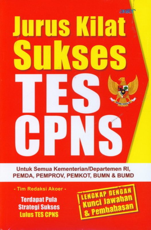 Buku "Jurus Kilat Sukses Tes CPNS" disusun demi memenuhi kebutuhan tersebut untuk semua orang yang ingin mengikuti seleksi penerimaan CPNS di seluruh departemen atau Kementerian Rl, PEMDA, PEMPROV, PEMKOT, BUMN, dan BUMD. Buku ini berisikan soal-soal pilihan yang kemungkinan besar keluar pada setiap penyelenggaraan tes CPNS lengkap dengan kunci jawaban dan pembahasannya yang detail dan sistematis.