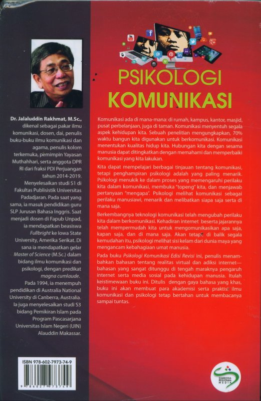 Pada buku Psikologi Komunikasi Edisi Revisi ini, penulis menambahkan bahasan tentang realitas virtual dan adiksi internet--bahasan yang sangat ditunggu di tengah maraknya pengaruh internet serta media sosial pada kehidupan manusia. Itulah keistimewaan buku ini. Ditulis dengan gaya bahasa yang khas, buku ini akan membuat para akademisi serta praktis: ilmu komunikasi dan psikologi tetap bertahan untuk membacanya sampai tuntas.
