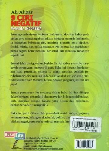 Seorang cendekiawan terkenal Indonesia, Mochtar Lubis, pada tahun 1977 menyampaikan pidato tentang manusia Indonesia. Ia menyebut beberapa ciri, misalnya munafik atau hipokrit, feodal, mistis, dan malas-malasan! Pro kontra dan perdebatan panas segera bermunculan. Benarkah ciri manusia Indonesia seperti itu? Setelah lebih dari 30 tahun berlalu, Dr. Ali Akbar mencoba menjawab pertanyaan tersebut diatas. Buku ini disusun berdasarkan hasil penelitian selama 10 tahun terakhir. Adakah perubahan ciri-ciri manusia Indonesia? Adakah ciri-ciri yang dulu tidak disebut oleh Mochtar Lubis? Adakah yang menjadi ciri kita juga? Semua pertanyaan itu tertuang dalam buku ini dan dikupas dalam berbagai perspektif, khususnya dari bidang sosial budaya, serta disajikan dengan bahasa yang ringan dan sederhana, bahkan terkadang menggelitik.