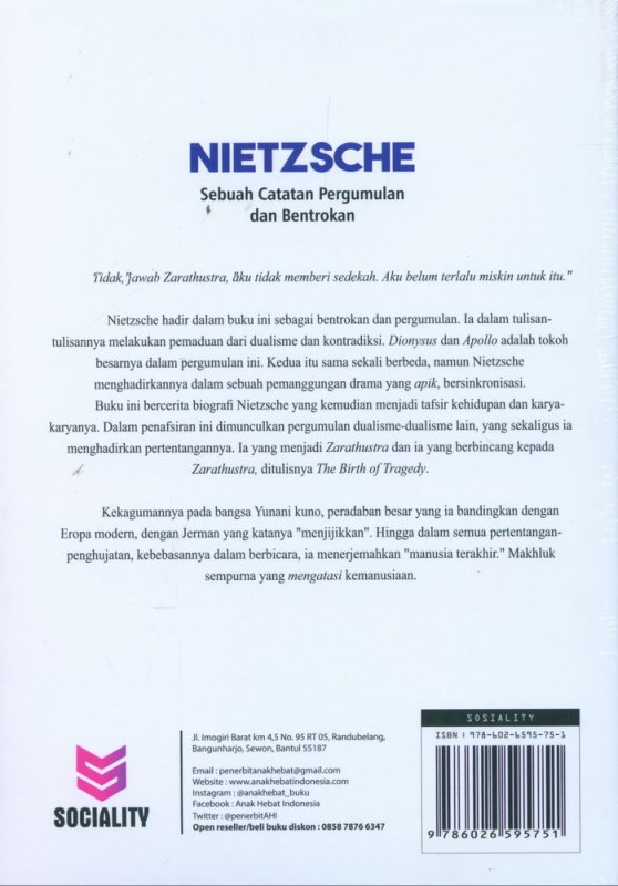 Buku ini bercerita biografi Nietzsche yang kemudian menjadi tafsir kehidupan dan karya-karyanya. Dalam penafsiran ini dimunculkan pergumulan dualisme-dualisme lain, yang sekaligus ia menghadirkan pertentangannya. Ia yang menjadi Zarathustra dan Ia yang berbincang kepada Zarathustra, ditulisnya The Birth of Tragedy.