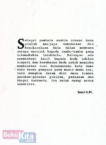 Sebagai pembaca sastra urusan Anda adalah menjaga kebebasan dan kesukarelaan Anda dalam membaca seraya merujuk kepada rambu-rambu yang dikemukakan terdahulu. Kalaupun ada permintaan lebih kepada Anda adalah simpati dan kesabaran Anda untuk mencoba membiarkan diri dipengaruhi kata demi akta kedua penyair yang masih muda ini, lalu mungkin dalam diri Anda timbul gerakan-gerakan pikiran, perasaan dan khayal tertentu. Itu sudah cukup untuk sementara.