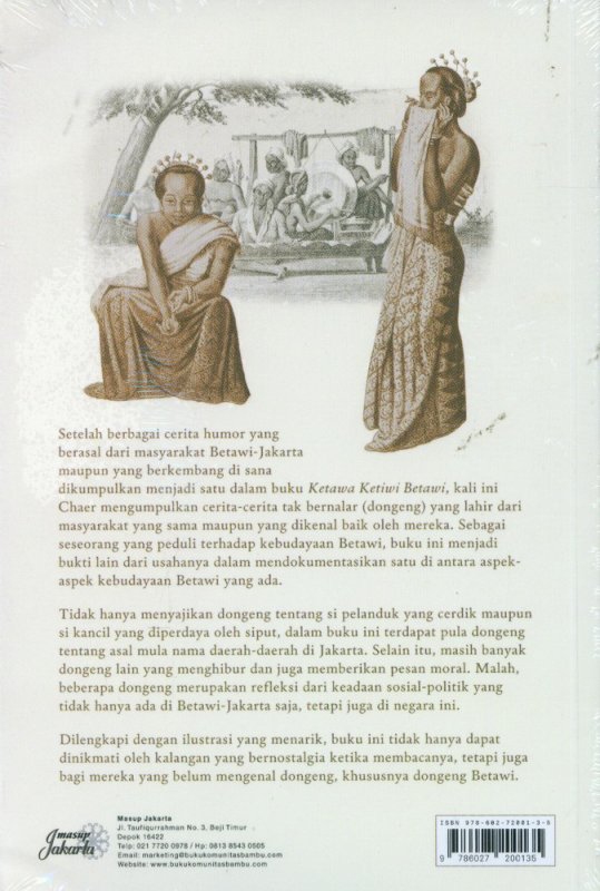 Setelah berbagai cerita humor yang berasal dari masyarakat Betawi-Jakarta maupun yang berkcmbang di Sana dikumpulkan menjadi satu dalam buku Ketawa Ketiwi Betawi, kali ini Chaer mengumpulkan cerita-cerita tak bernalar (dongeng) yang lahir dari masyarakat yang sama maupun yang dikenal baik oleh mereka. Sebagai seseorang yang peduli terhadap kebudayaan Betawi, buku ini menjadi bukti lain dari usahanya dalam mendokumentasikan satu di antara aspek-aspek kebudayaan Betawi yang ada.