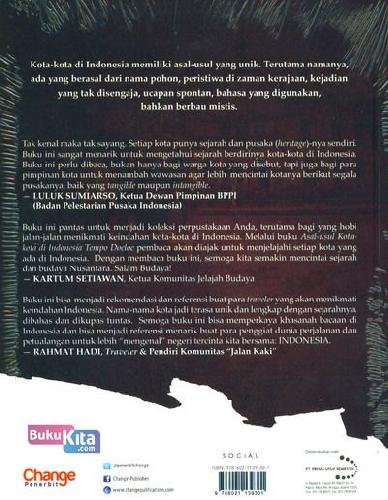 Tak kenal maka (ok sayang. Setiap kota punya sejarah dan pusaka (lwritage)-nya scndiri. Buku ini sangat mcnarik untuk mengetahui sejarah berdirinya kota-kota di Indonesia. Buku ini perlu dibaca, bukan hanya bagi warga kota yang disebut, tapi juga bagi para pimpinan kota untuk menambah wawasan agar lebih mencintai kotanya berikut segala pusakanya, baik yang tangible maupun intangible.